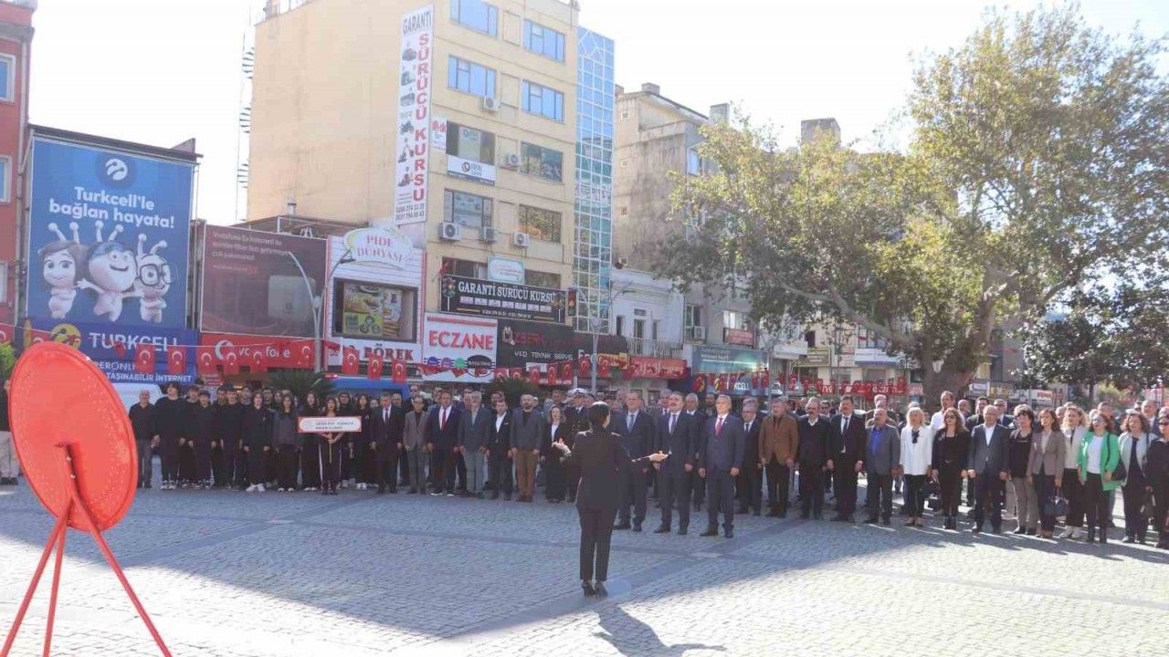 Cumhuriyet Meydanı’nda gerçekleştirilen program, Muhtarlar Derneği tarafından Atatürk Anıtı’na çelenk sunumu ile başladı. Çelenk sunumunun ardından saygı duruşunda bulunuldu ve İstiklal Marşı okundu.