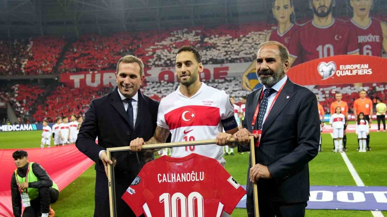 A Milli Futbol Takımı, 2026 FIFA Dünya Kupası Avrupa Elemeleri E Grubu 4. maçında Kocaeli’de Gürcistan ile karşı karşıya gelirken, müsabaka öncesinde Kaptan Hakan Çalhanoğlu onurlandırıldı. Bulgaristan mücadelesiyle ay-yıldızlılarda 100. maçını oynayan Çalhanoğlu’na Gürcistan karşılaşması öncesinde saha kenarında Türkiye Futbol Federasyonu Başkan Vekili Mecnun Otyakmaz ve Türkiye Futbol Federasyonu Genel Sekreteri Abdullah Ayaz, plaket takdim ederken ayrıca çerçeveletilmiş şeklinde üzerinde 100 yazan milli takım forması verildi.