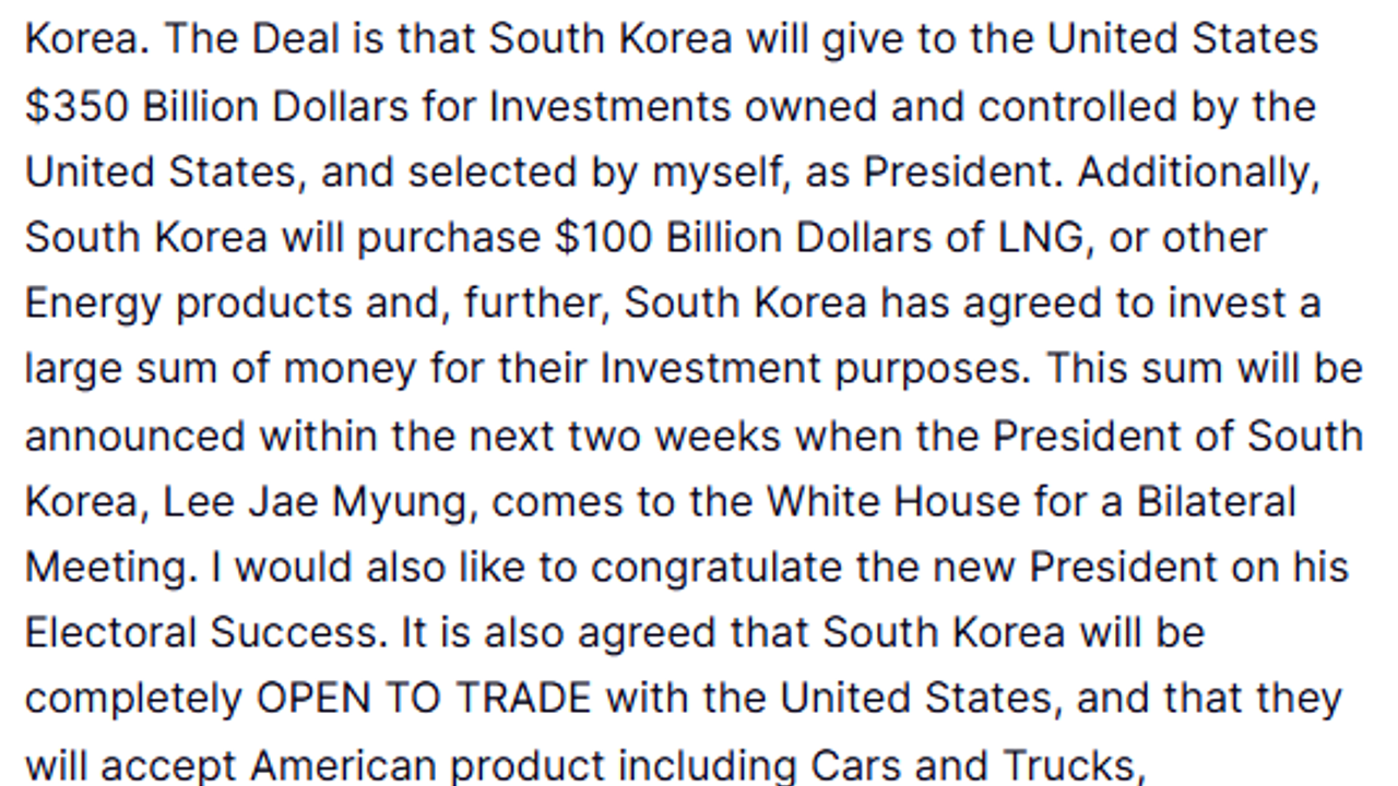 ABD Başkanı Donald Trump’tan, Güney Kore ile yürütülen ticaret müzakereleri ile ilgili kritik bir açıklama geldi. Kendisine ait Truth sosyal medya platformundan paylaşımda bulunan Trump, Güney Kore ile "tam ve kapsamlı" bir ticaret anlaşmasına varıldığını açıkladı. "Anlaşmaya göre, Güney Kore bizzat başkan olarak tarafımdan seçilecek, mülkiyeti ve kontrolü ABD’ye ait yatırımlar için ülkemize 350 milyar dolar sağlayacak" diyen Trump, "Ayrıca, Güney Kore 100 milyar dolar değerinde LNG (sıvılaştırılmış doğal gaz) ve diğer enerji ürünlerini satın alacak" ifadelerini kullandı.