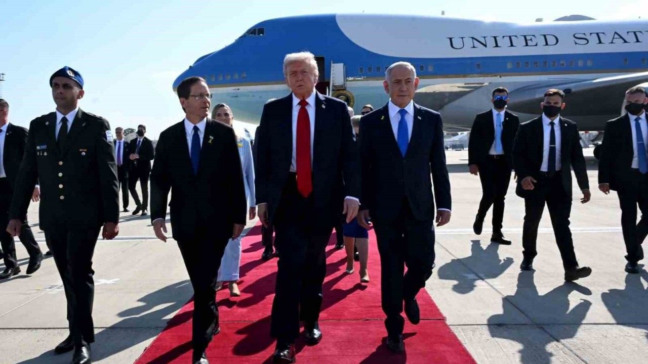 ABD Başkanı Donald Trump, Gazze’de ateşkese varılmasının ardından Orta Doğu ziyaretine başladı. Trump’ı taşıyan Air Force One, TSİ 10.00 sıralarında Tel Aviv’deki Ben Gruion Havalimanı’na indi. Mısır’da Şarm El-Şehy’te bugün yapılacak zirve öncesinde Trump, havalimanında İsrail Cumhurbaşkanı Isaac Herzog ve eşi, İsrail Başbakanı Binyamin Netanyahu ve eşi, Trump’ın Orta Doğu Özel Temsilcisi Steve Witkoff, ABD’nin İsrail Büyükelçisi Mike Huckabee, İsrail’in Washington Büyükelçisi Yechiel Leiter, Trump’ın damadı Jared Kushner, kızı Ivanka Trump ve yetkililer tarafından karşılandı. Trump, uçaktan inişinin ardından Netanyahu ve Herzog ile uzun bir sohbet gerçekleştirdi.