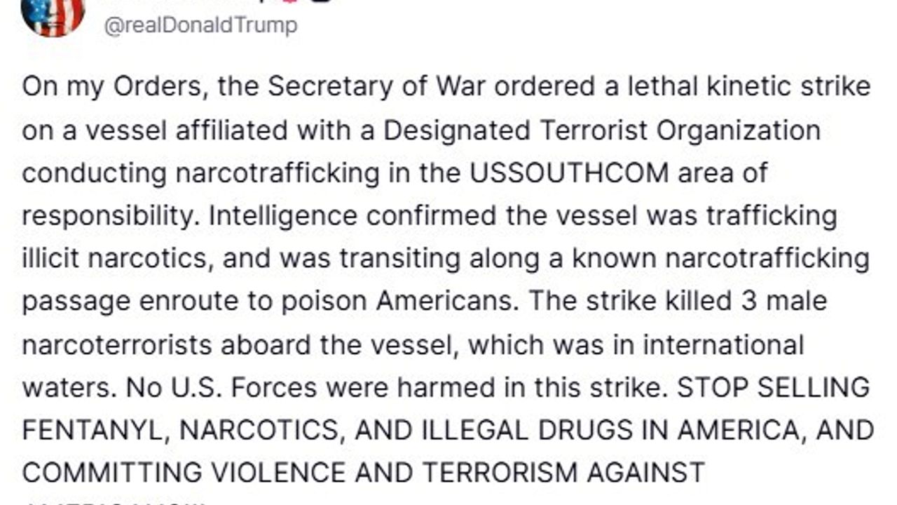 ABD Başkanı Donald Trump, ABD ordusunun uyuşturucu taşıyan bir tekneye saldırı düzenleyerek 3 erkek "narko-teröristi" öldürdüğünü açıkladı.