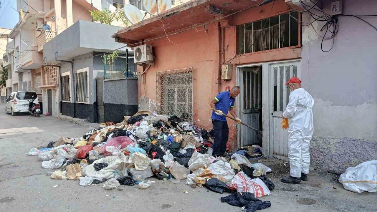 Adana’da kötü koku ihbarı üzerine girilen böceklerin sardığı bir müstakil evden, 2 kamyonet dolusu çöp çıkartıldı.