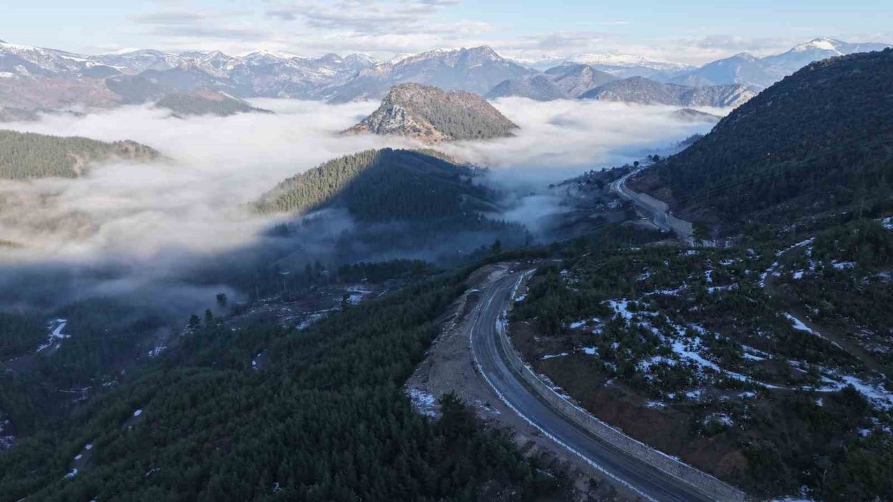 Adana'nın Feke ilçesinde, kızılçam ormanları ve karlı dağların arasında sabah saatlerinde oluşan sis, muhteşem bir manzara sundu.