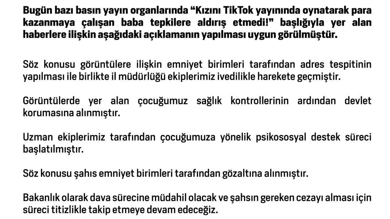 Aile ve Sosyal Hizmetler Bakanlığı, bazı basın yayın organlarında ‘Kızını TikTok yayınında oynatarak para kazanmaya çalışan baba tepkilere aldırış etmedi’ başlığıyla yer alan haberlere ilişkin açıklamalarda bulundu. Bakanlık tarafından yapılan açıklamada şu ifadelere yer verildi: