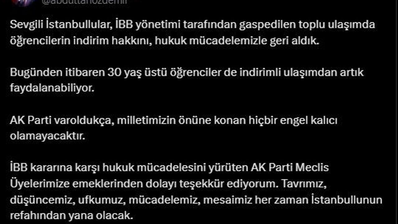 İstanbul Büyükşehir Belediyesi (İBB) tarafından iptal edilen 30 yaş üstü öğrencilerin indirimli ulaşım hakkını AK Parti İstanbul İl Başkanı Abdullah Özdemir, hukuk mücadelesinin ardından geri aldıklarını duyurdu.