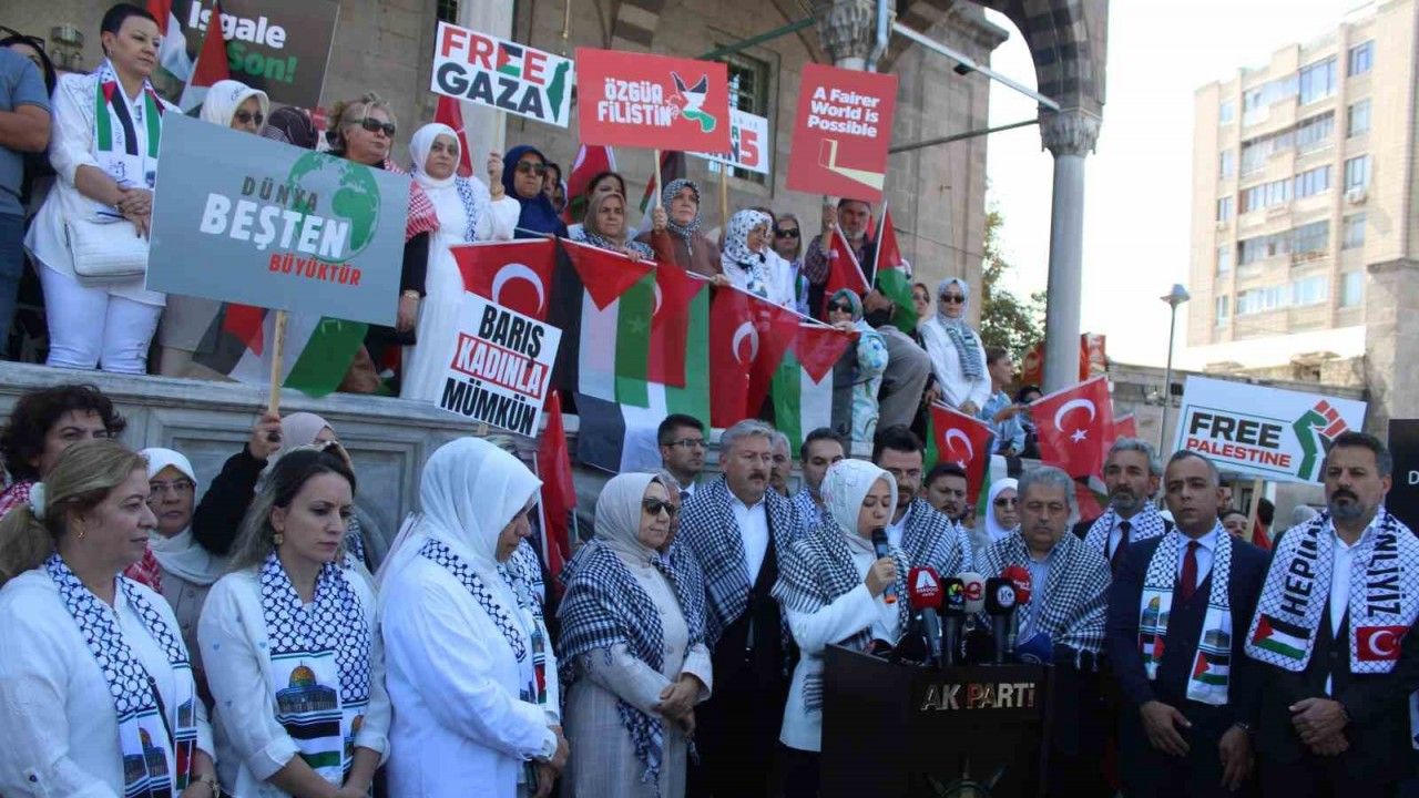 Gazze’de evlatlarını kaybeden anne-babaların zinciridir. Öksüz, yetim bırakılan çocukların zinciridir, ve insanlığını kaybetmeyen herkesin zinciridir. Biz; ’Yaralıları mı kurtaracaktım, şehitleri mi taşıyacaktım ya da bir torba un mu bulmaya çalışacaktım? Yemin ederim eve tek bir torba un getirip, çocuklarımın karnının doyacağını bilsem, ölüme razı olurum’ diyen Gazzeli annenin sesi olmak için, bu sesi dünyaya duyurmak için buradayız. Bu zulmü görmezden gelen herkese soruyorum; kalbiniz nerede? Yüce Rabbimiz mealen ’Bir insanı öldüren, bütün insanlığı öldürmüş gibidir. Bir canı yaşatan, bütün insanlığı yaşatmış gibidir’ buyuruyor. Gazze; bu ilahi kelamın sarsıcı bir imtihanıdır. Bizler İstanbul’dan, Hakkari’den, Trabzon’dan, Erzurum’dan ve Türkiye’nin 81 ilinden dünyanın dört bir yanındaki kadınlara, kız kardeşlerimize sesleniyoruz: Barış kadınla mümkün. Barışçıl bir şekilde yola çıkan ve uluslararası sularda haydut İsrail’in hukuksuz müdahalesine uğrayan Küresel Sumud Filosu’nu dünya öylece seyretti. Hamdolsun Türkiye; Cumhurbaşkanımız Recep Tayyip Erdoğan’ın kararlılığıyla bu adaletsizlik karşısında da sessiz kalmadı. Sadece kendi ülkesinin vatandaşlarını değil, 13 ülkeden 101 vicdan sahibi gönüllünün de ülkelerine güvenle dönmelerini sağladı. Bizler de ablukayı delmek ve insanlık onurunu korumak için mücadele eden kahramanların ülkemize dönüşlerinde oradaydık. Hepsinin dilinde aynı temenni vardı; ’Biz elimizden geleni yaptık, umarım Gazze’ye bir umut ışığı olabilmişizdir’. İşte bugün o umut sözleri de bu meydanda yankılanıyor. Biz bugün bütün kimliklerimizden sıyrılarak; sadece kadın kimliğimizle buradayız. Çünkü bu mesele ne dünyadaki rollerimizle, ne taşıdığımız unvanlarla, ne de sahip olduklarımızla ilgilidir, bu mesele insanlık meselesidir. Bugün Türkiye’den tüm dünyaya tek bir şey söylüyoruz; barış kadınla mümkündür" diye konuştu.