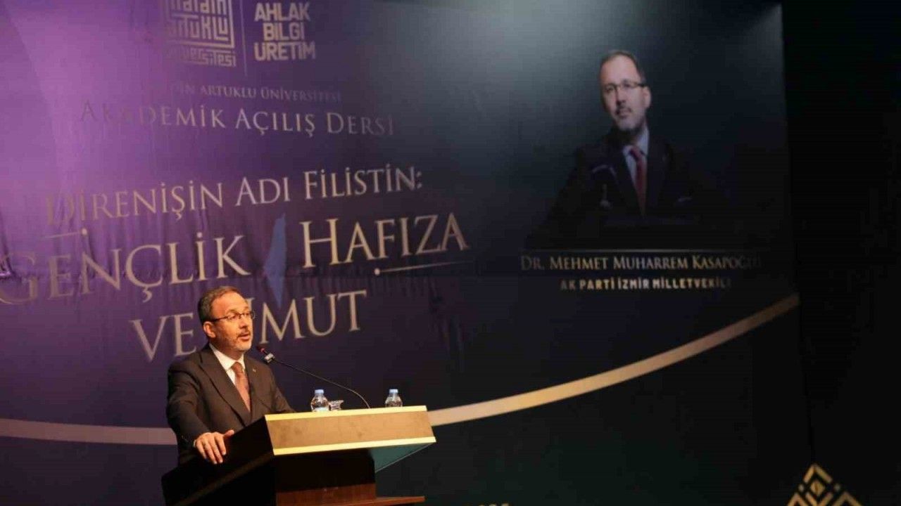 AK Parti İzmir Milletvekili Mehmet Muharrem Kasapoğlu, Mardin Artuklu Üniversitesi’nde gerçekleştirilen 2025-2026 Akademik Yılı Açılış Dersi’nde gençlere hitap etti. "Direnişin Adı Filistin: Gençlik, Hafıza ve Umut" başlığıyla düzenlenen programda konuşan Kasapoğlu, "Filistin davasını konuşmak, sadece bir coğrafyanın değil, insanlık onurunun davasını konuşmaktır. Ben bu dersi bir yönelişin adı olarak görüyorum. Hangi değerlerle yola çıktığımız ve hangi kavramları zihnimizde taşıdığımız; mazlumun yanında durma irademizi, adalet ve vicdan ekseninde kurduğumuz insanlık çizgisini belirler" ifadelerini kullandı.