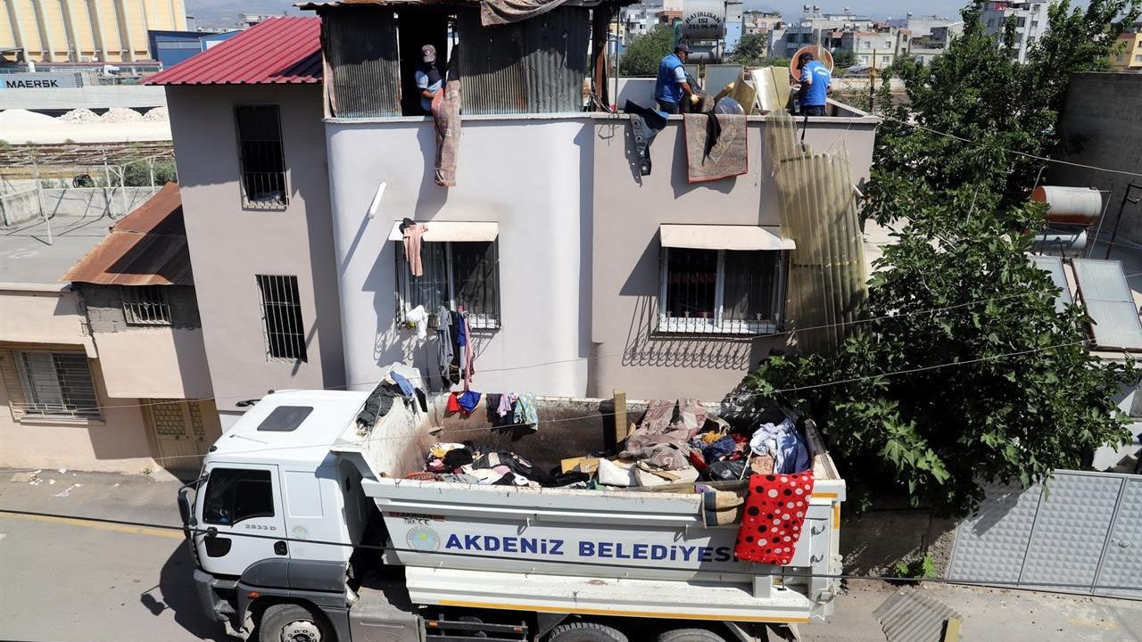 Mersin'in Akdeniz ilçesindeki bir evden kötü koku ve görüntü kirliliği şikayetleri üzerine 2 kamyon çöp çıkarıldı.