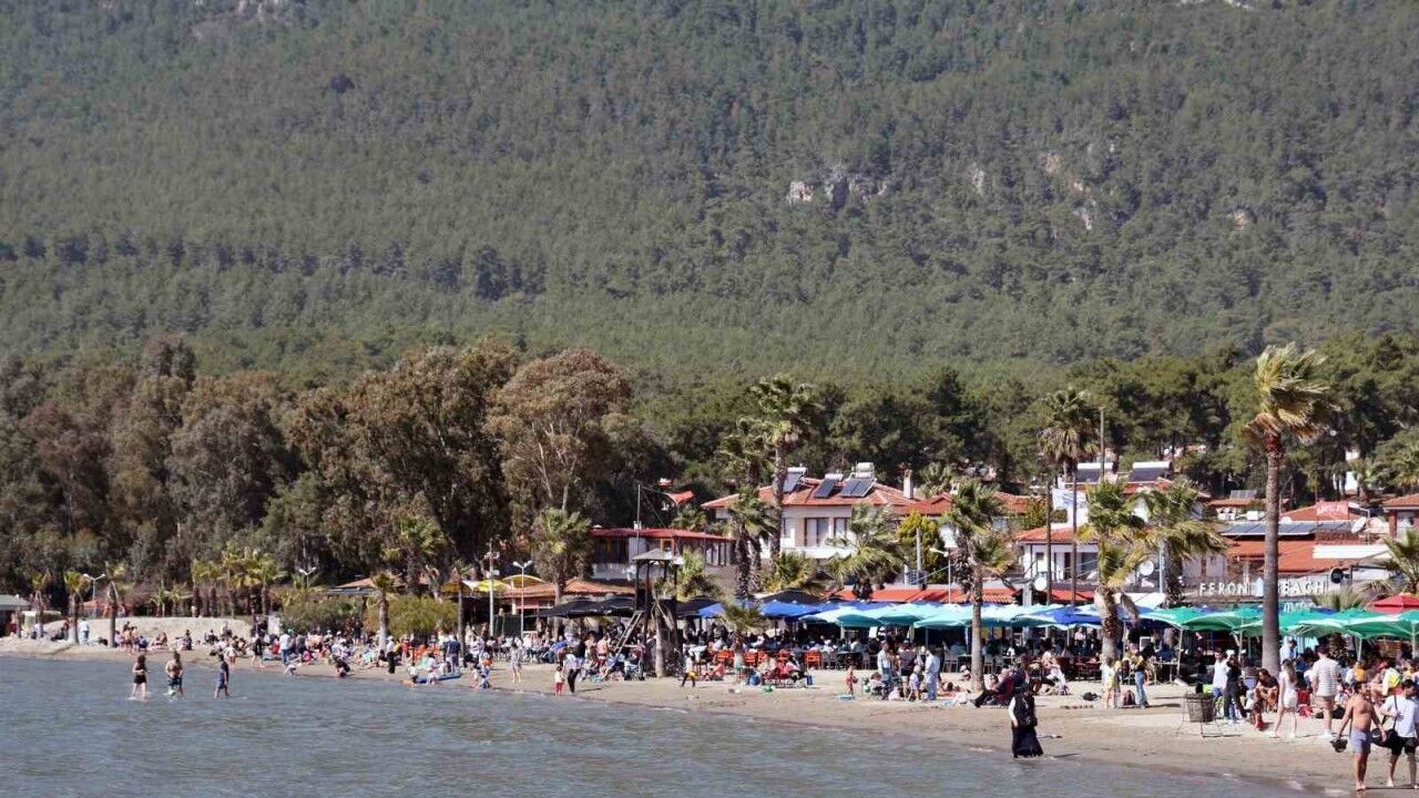 Hava sıcaklığının 27 derece çıktığı Muğla’nın günübirlik tatil beldesi Ula’nın Akyaka mahallesinde vatandaşlar sıcak hava ve güneşten yararlanmak için sahile akın eti.