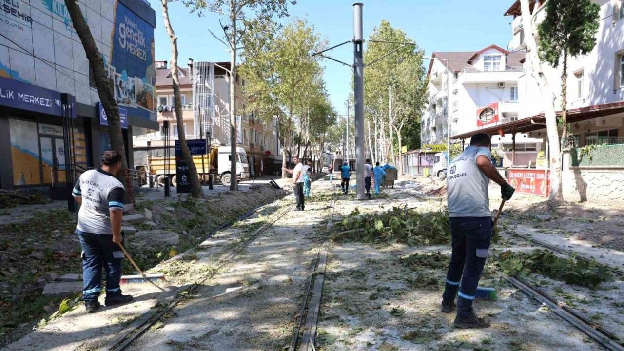 Kocaeli Büyükşehir Belediyesi, Alikahya Tramvay Hattı üzerinde yer alan ağaçların çalışmalar sırasında zarar görmemesi için budamasını gerçekleştiriyor.
