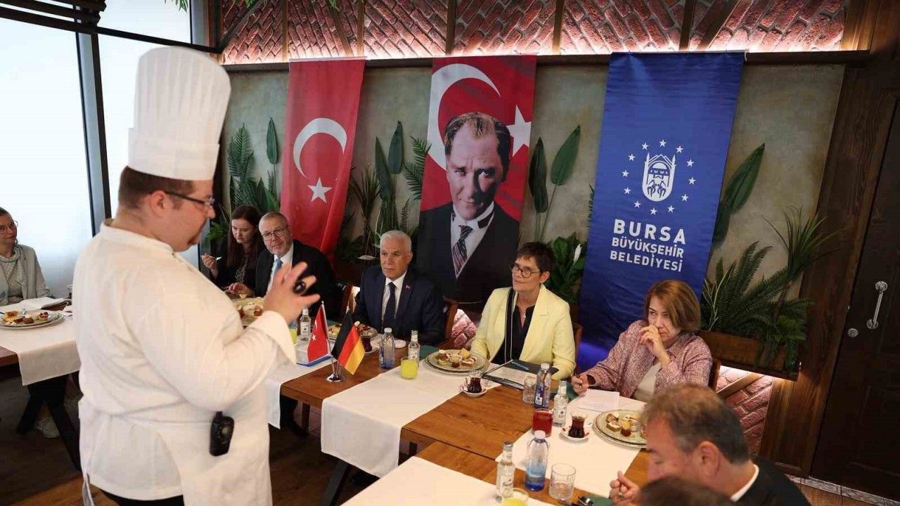 Konuşmaların ardından Bursa’nın ünlü şeflerinden Ali Müfit Çağlayan tarafından hazırlanan Bursa’ya özgü tatlar, misafirlere ikram edildi. Kullanılan ürünler ve hikayeleri hakkında konuklara bilgiler verildi. Sunulan yemekleri büyük beğeniyle yiyen yabancı konuklar, Başkan Mustafa Bozbey’e ve Şef Ali Müfit Çağlayan’a teşekkür etti. Başkan Bozbey, Alman heyeti 26-27-28 Eylül tarihlerinde yapılacak Bursa Gastronomi Festivali’ne davet etti.