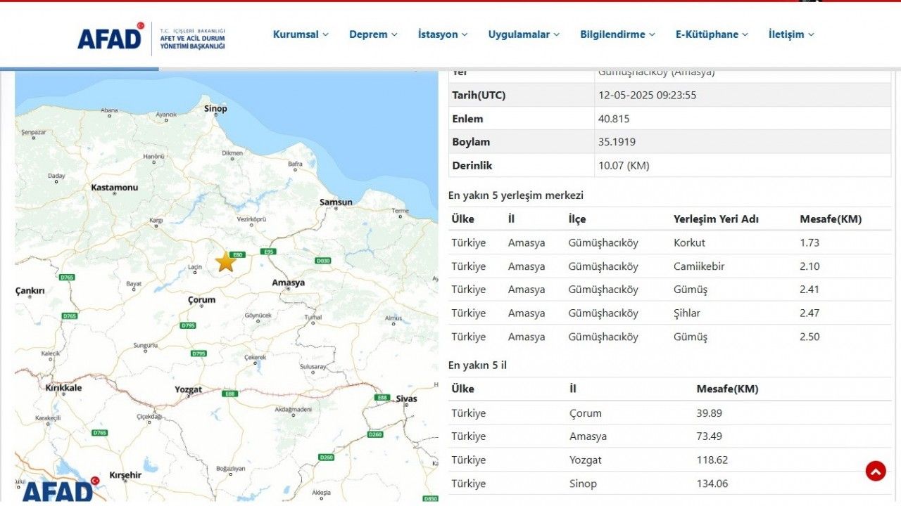 Afet ve Acil Durum Yönetimi Başkanlığı (AFAD) verilerine göre, saat 12.23’te merkez üssü Amasya’nın Gümüşhacıköy ilçesi olan 4.4 büyüklüğünde bir deprem kaydedildi. Yerin 10.07 kilometre derinliğinde gerçekleşen deprem, özellikle Amasya kent merkezi ve ilçelerinde, Samsun’un doğu kesimlerinde ve çevre illerde hissedildi.
