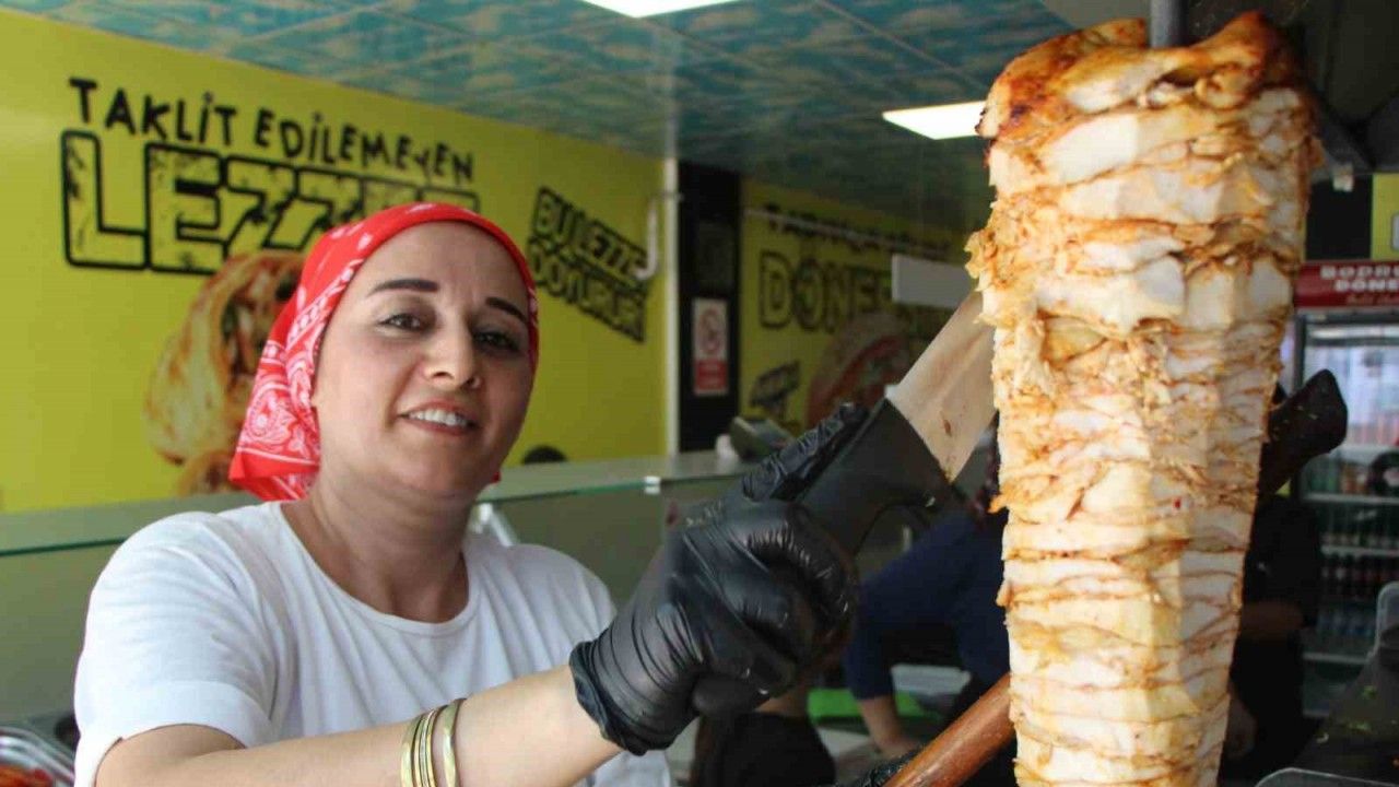Yaşadığı mahalledeki bir dönercide yardım etmek amacıyla işe başlayıp merak ettiği döner tezgahının karşısında kendini bulan 2 çocuk, 1 torun sahibi Birsen Doğan’ın kendi hazırlayıp kestiği dönerler büyük beğeni topluyor.