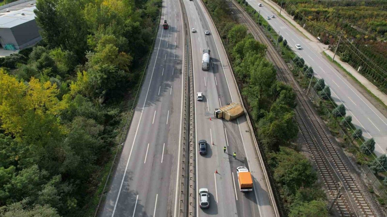 Anadolu Otoyolu Sakarya geçişinde kontrolden çıkan kamyonet yan yattı. Otoyolun İstanbul istikametinde uzun araç kuyrukları oluşurken, olay yeri havadan görüntülendi.