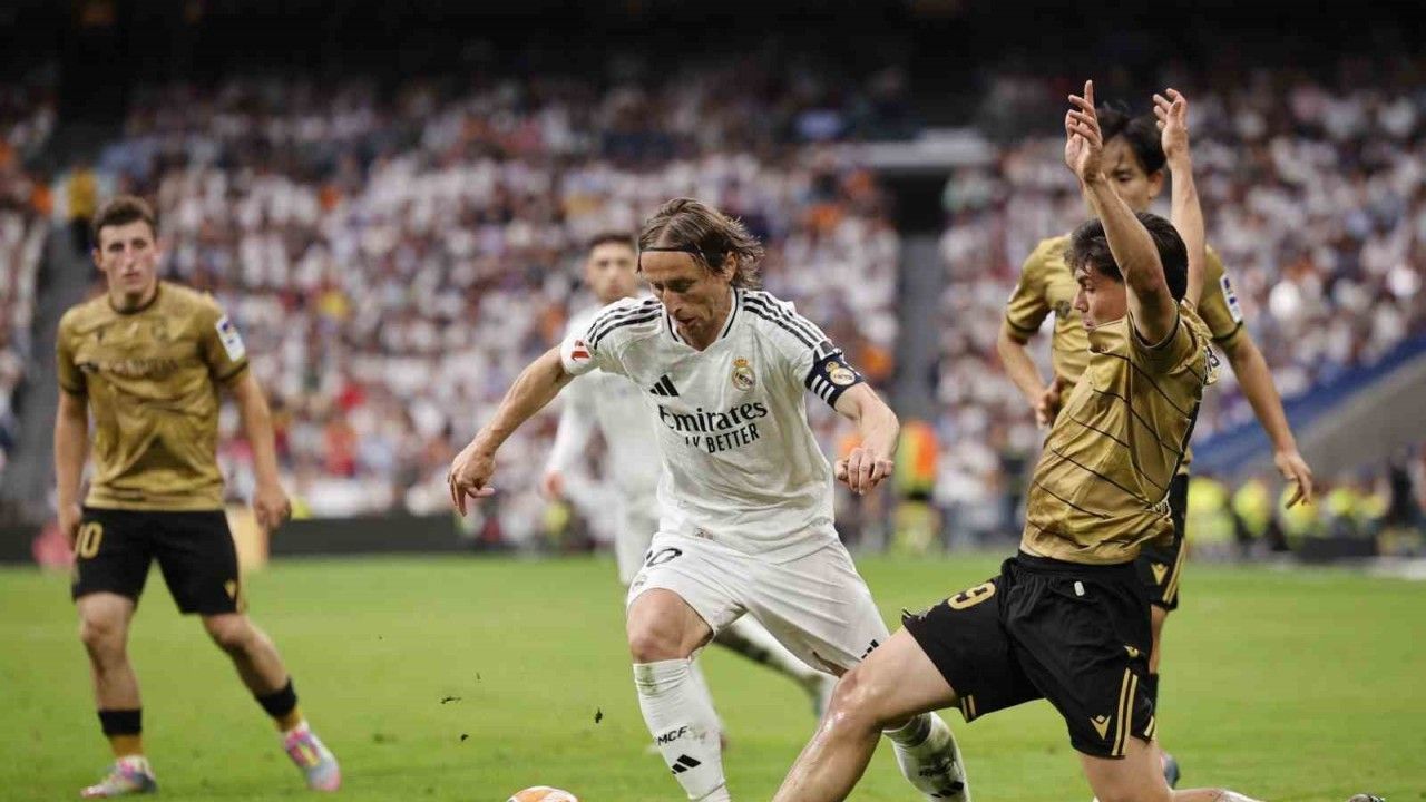 La Liga’nın 38. ve son haftasında Real Madrid, evinde Real Sociedad ile karşılaştı. Geçtiğimiz günlerde yolların ayrıldığı açıklanan deneyimli teknik adam Carlo Ancelotti ve efsane futbolcu Luka Modric için Bernabeu’de anlamlı pankartlar yer aldı. Eflatun-beyazlılarda milli futbolcu Arda Güler, 11’de maça başladı. Kazanılan penaltıda 38. dakikada topun başına geçen Kylian Mbappe vuruşunda kaleci Larranaga’ya takılırken, seken topu ağlara gönderdi. İlk yarısı bu golle tamamlanan müsabakada ev sahibi 83. dakikada Fransız yıldızı ile 1 gol daha buldu. Luka Modric 87. dakikada kenara gelirken, iki takımın futbolcuları ve taraftarlar tarafından alkışlandı. Modric, saha kenarına geldiği esnada ise gözyaşlarına hakim olamadı.
