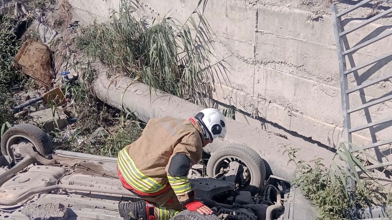 Hatay’da kontrolden çıkarak menfeze devrilen otomobilin sürücüsü yaralandı.