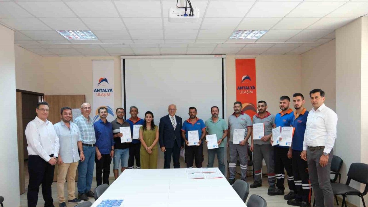 Antalya Ulaşım A.Ş. bünyesinde görev yapan 12 teknik personel, MYK belgesi alarak "Raylı Sistem Araçları Mekanik Bakım ve Onarımcısı" ile "Demiryolu Yol Yapım, Bakım ve Onarımcısı" unvanlarını kazandı. Eğitimlerini tamamlayan personelin sertifikaları, Genel Müdür Melih Dipova tarafından takdim edildi.