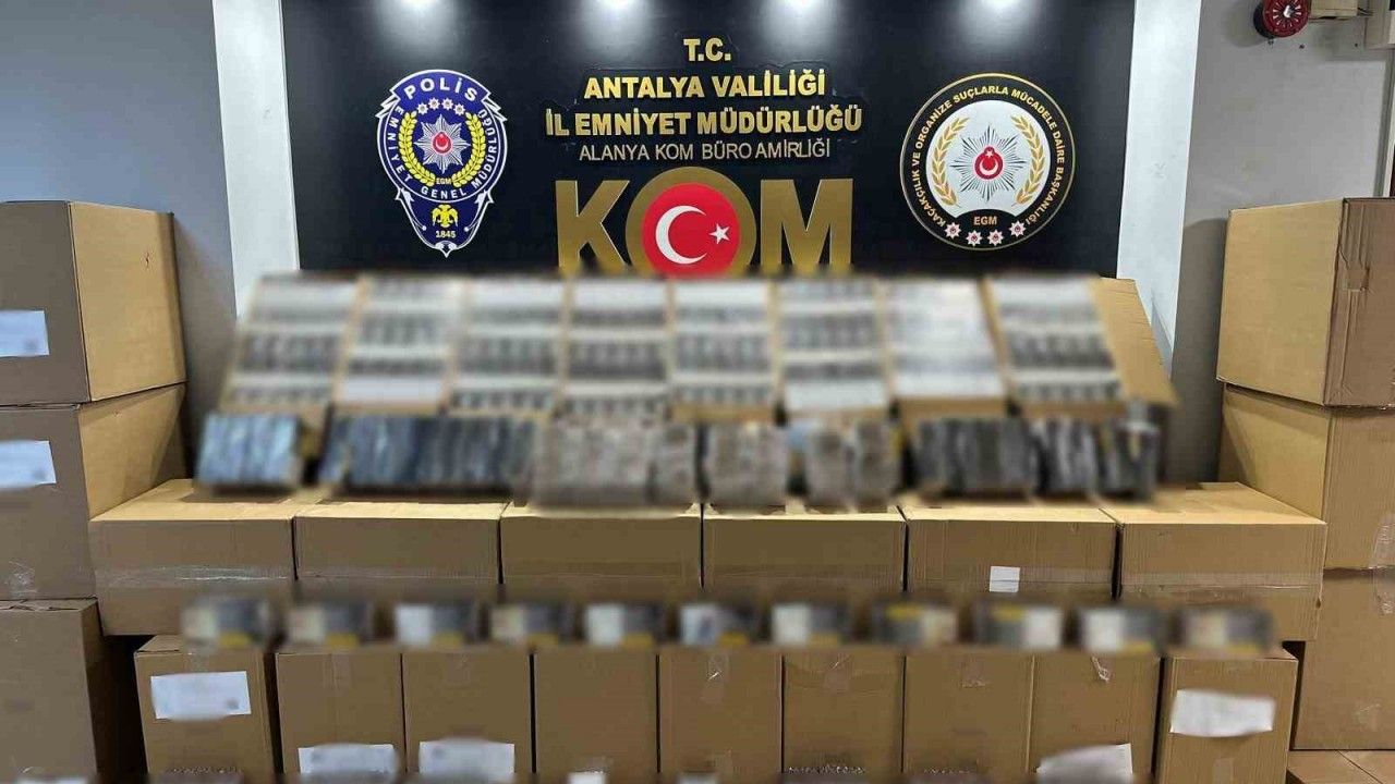 Kepez, Muratpaşa, Alanya, Manavgat ve Kumluca ilçelerinde düzenlenen operasyonlarda iş yeri, depo ve ikametlerde yapılan aramalarda; 733 bin 80 adet kaçak boş ve dolu makaron, bin 480 paket kaçak sigara, 295 adet elektronik sigara, 166 kilogram kıyılmış tütün, 100 litre kaçak içki ve 49 adet kaçak emtia ele geçirildi.