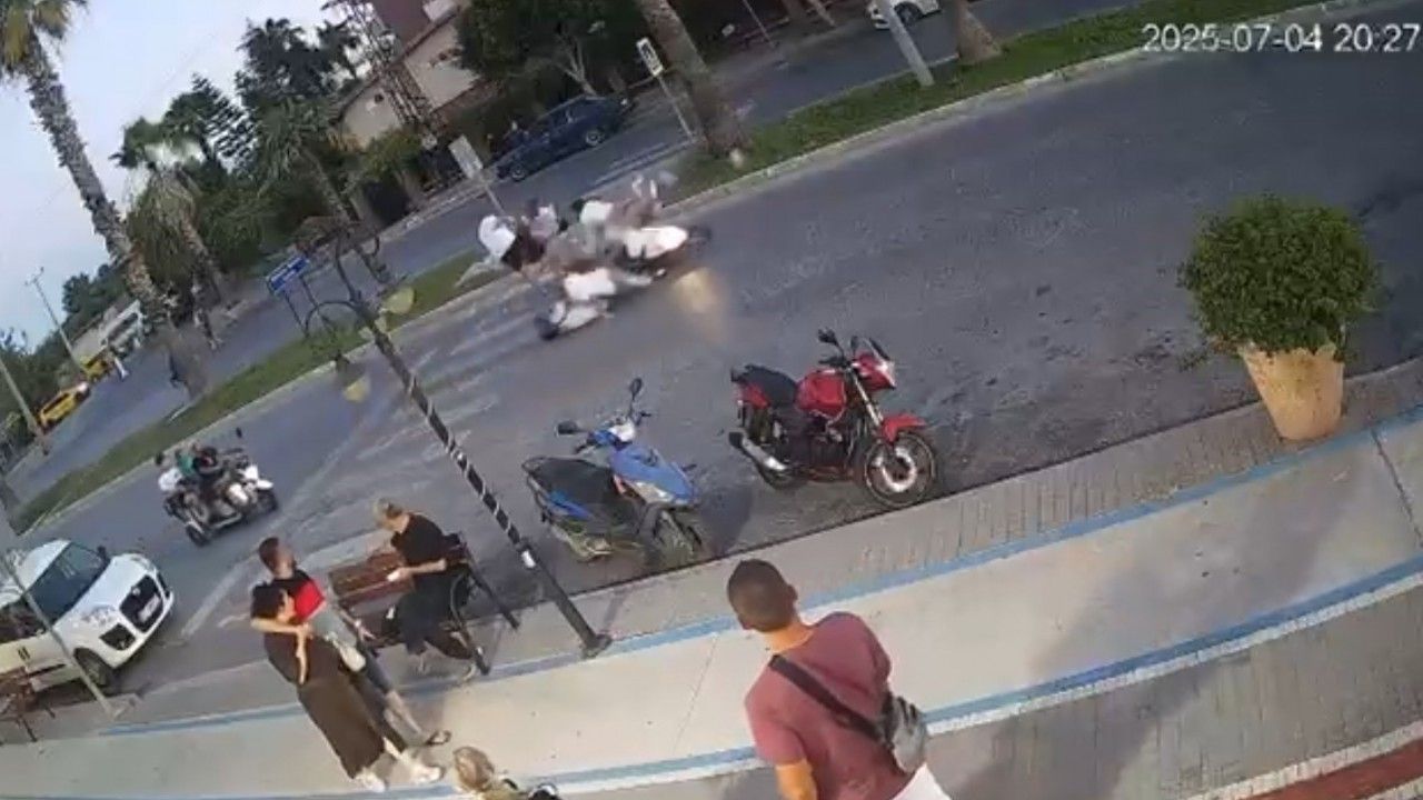 Antalya’nın Manavgat ilçesinde, yaya geçidinde karşıya geçmeye çalışan turistleri fark eden motosiklet sürücüsü ani fren yapınca motosikletiyle birlikte kayarak yere düştü. Güvenlik kamerasına yansıyan kazada 3’ü Rus turist, 1’i motosiklet sürücüsü olmak üzere toplam 4 kişi yaralandı.