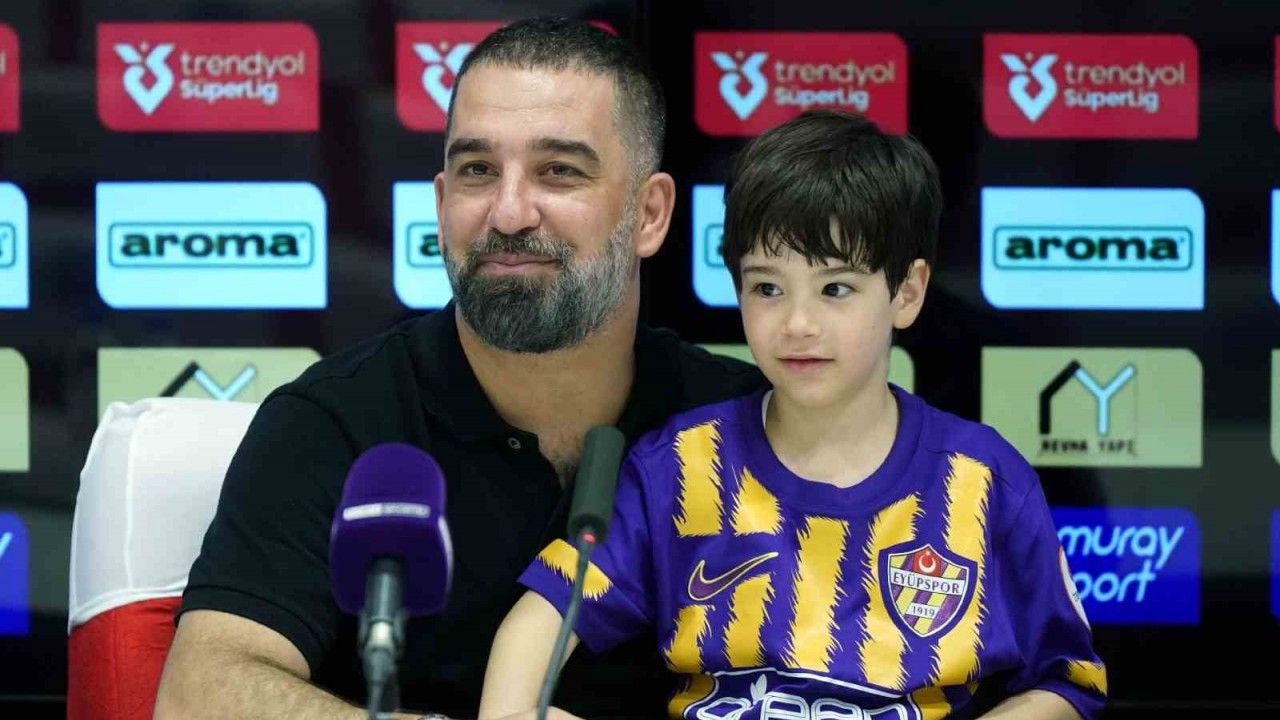 Arda Turan, eflatun-sarılı ekibin başında çıktığı son basın toplantısına oğlu Hamza ile birlikte çıktı.