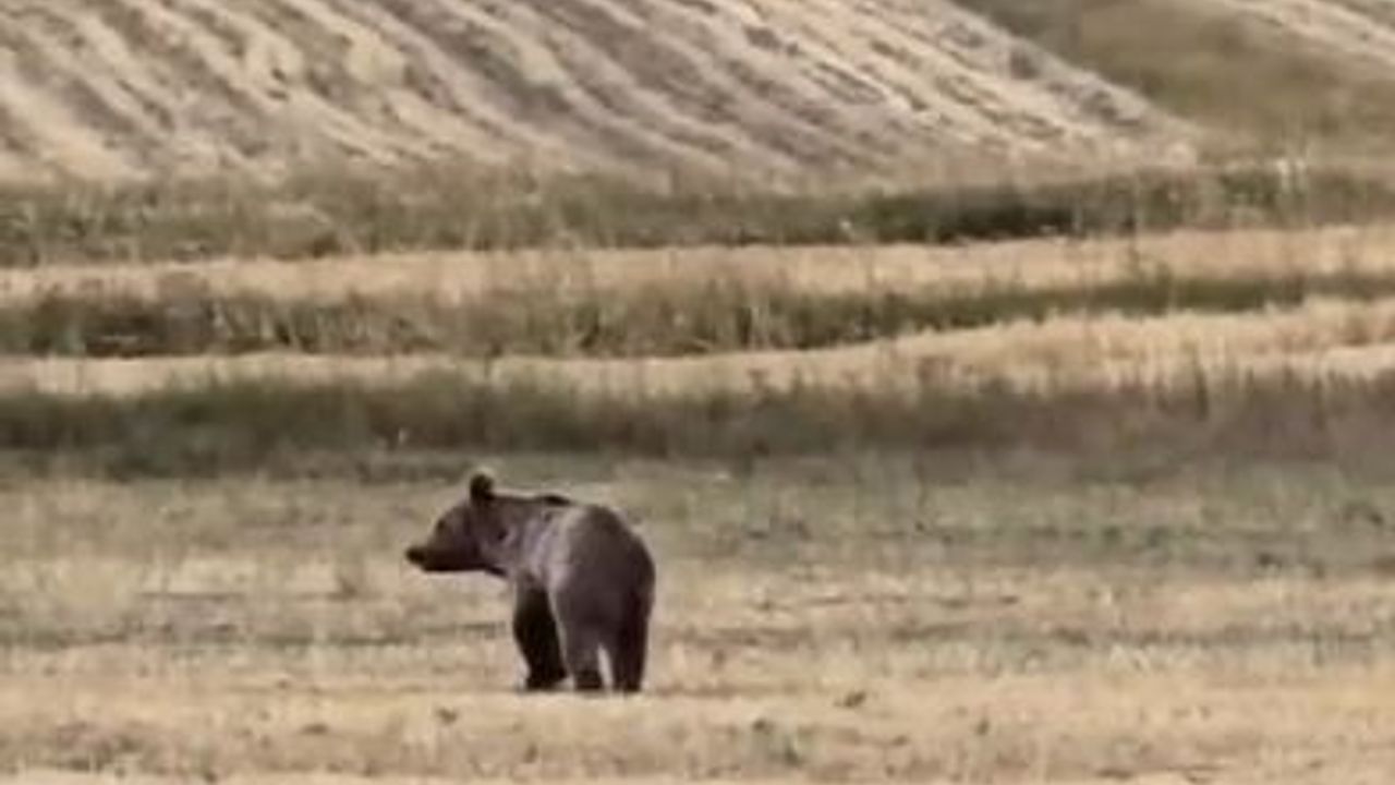 Tarlalarda yiyecek arayan boz ayı insanları fark edince kaçarak uzaklaştı.