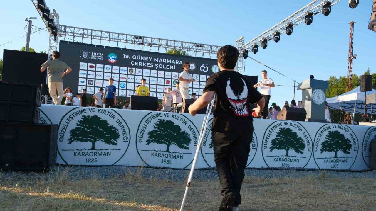 Bursa’da düzenlenen 19. Güney Marmara Çerkes Şöleni’nde izleyenlerin yüreğini burkan bir an yaşandı. Bugüne kadar arkadaşları ile birlikte sahne alan genç, ayağını kırınca gösteriye katılamadı. Koltuk değnekleriyle tören alanına gelen genç, prova yapan arkadaşlarına uzaktan eşlik etti.