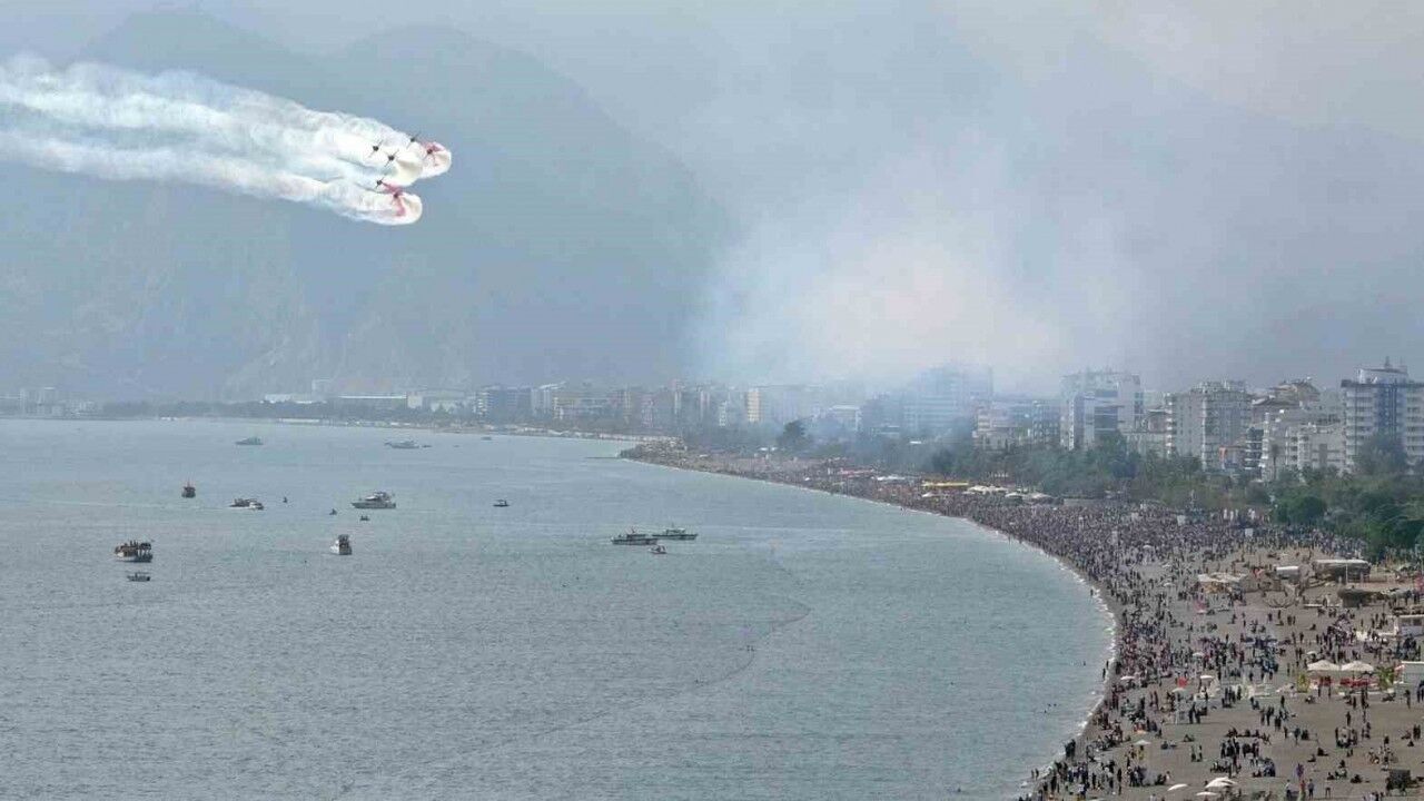 Yaklaşık yarım saat süren gösteri uçuşundan saatler öncesi Konyaaltı Sahili’ne gelen Antalyalılar ve turistler, sahil ve falezler kısmını hınca hınç doldurdu. Sahildeki doluluk görüntüsü Antalya’nın yaz aylarını aratmazken, falezlerden uçuşu izlemek isteyen bazı vatandaşlar çitleri aşıp yerini aldı.
