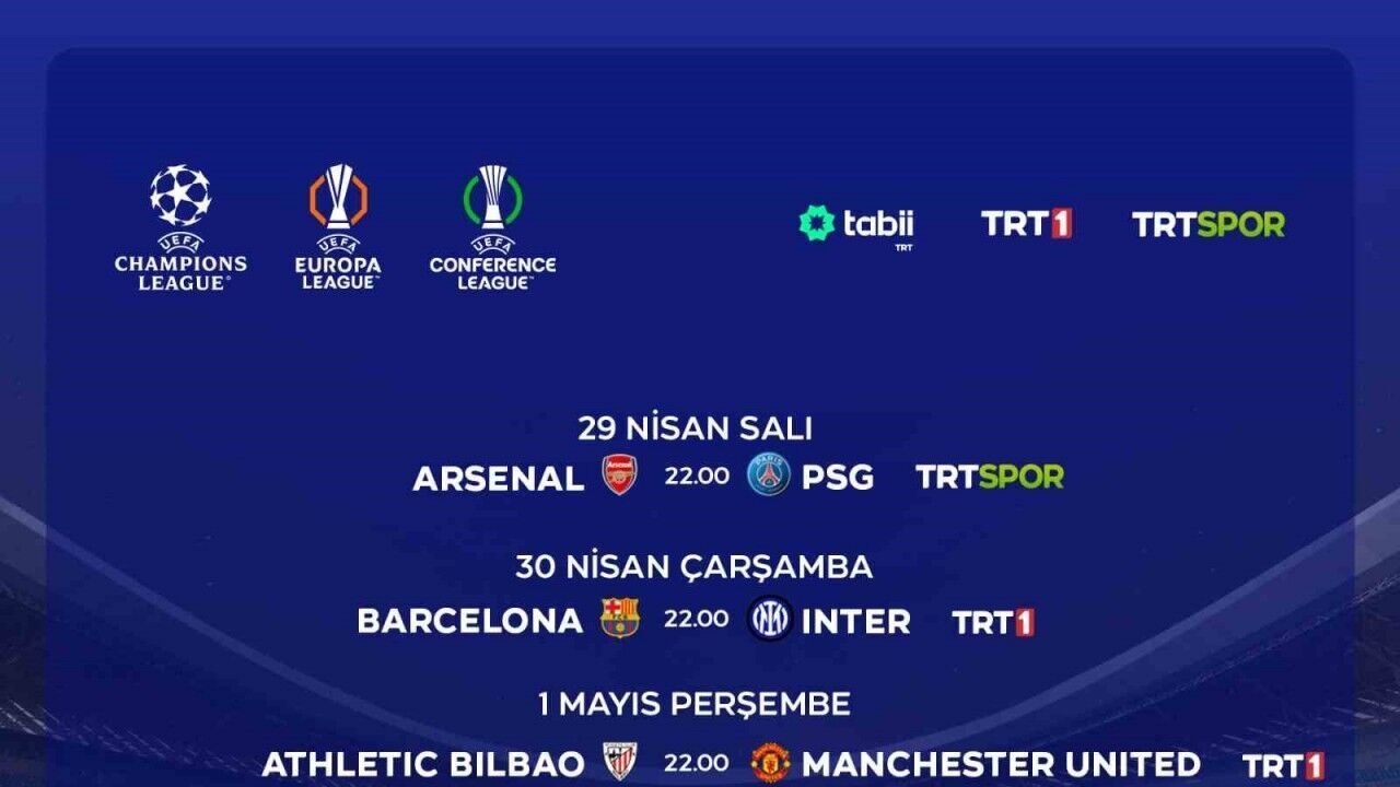 UEFA Şampiyonlar Ligi, Avrupa Ligi, Konferans Ligi ve UEFA Süper Kupa’nın yayın haklarını 3 yıllığına alan TRT, futbolseverlere bu büyük heyecanı yaşatmaya devam ediyor. UEFA maçlarının yarı final aşamasında, bazı karşılaşmalar TRT 1 ve TRT Spor üzerinden, diğer mücadeleler ise tabii platformunda izlenebilecek.