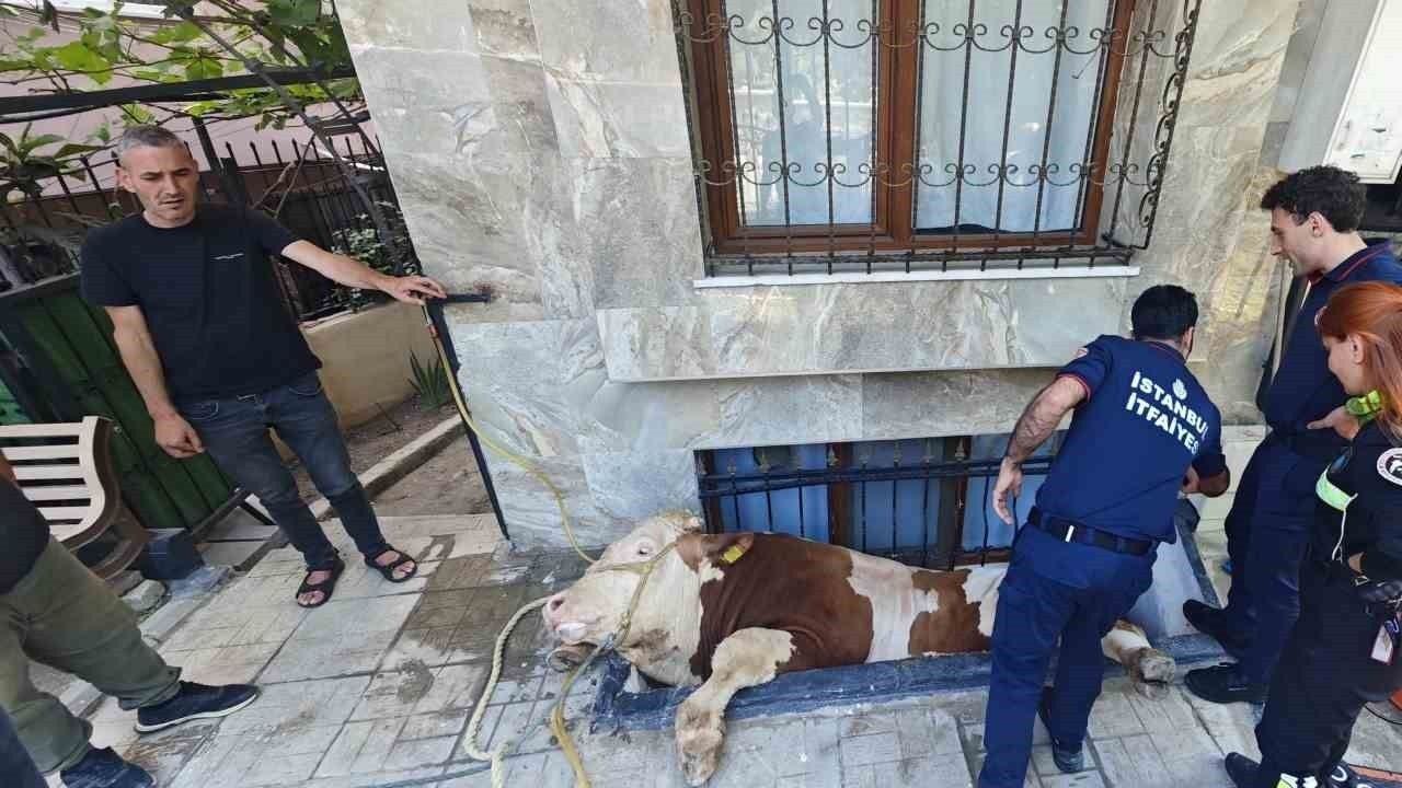 İstanbul Bahçelievler’de sahibinin elinden kaçarak pencere boşluğuna düşen kurbanlık boğa, Bahçelievler Belediye ekiplerinin çalışmasıyla kurtarıldı.