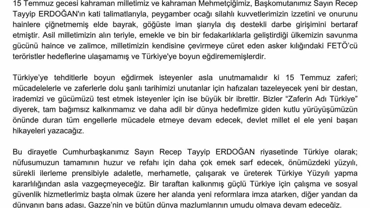 "Ülkemizin kılcal damarlarına kadar sızan habis ve hain terör örgütü FETÖ’nün bizzat aziz milletimiz tarafından hezimete uğratıldığı gün olan 15 Temmuz Demokrasi ve Milli Birlik Günü’müzü en içten dileklerimle tebrik ediyor, aziz şehitlerimizi ve gazilerimizi hayırla yad ediyorum. 15 Temmuz gecesi kahraman milletimiz ve kahraman Mehmetçiğimiz, Başkomutanımız Recep Tayyip Erdoğan’ın kati talimatlarıyla, peygamber ocağı silahlı kuvvetlerimizin izzetini ve onurunu hainlere çiğnetmemiş elde bayrak, göğüste iman şiarıyla dış destekli darbe girişimini bertaraf etmiştir. Asil milletimizin alın teriyle, emekle ve bin bir fedakarlıklarla geliştirdiği ülkemizin savunma gücünü haince ve zalimce, milletimizin kendisine çevirmeye cüret eden asker kılığındaki FETÖ’cü teröristler hedeflerine ulaşamamış ve Türkiye’ye boyun eğdirememişlerdir. Türkiye’ye tehditlerle boyun eğdirmek isteyenler asla unutmamalıdır ki 15 Temmuz zaferi; mücadelelerle ve zaferlerle dolu şanlı tarihimizi unutanlar için hafızaları tazeleyecek yeni bir destan, irademizi ve gücümüzü test etmek isteyenler için ise büyük bir ibrettir. Bizler ‘Zaferin Adı Türkiye’ diyerek, tam bağımsız kalkınmamız ve daha adil bir dünya hedefimize giden kutlu yürüyüşümüzün önünde duran tüm engellerle mücadele etmeye devam edecek, devlet millet el ele yeni başarı hikayeleri yazacağız. Bu dirayetle Cumhurbaşkanımız Recep Tayyip Erdoğan riyasetinde Türkiye olarak; nüfusumuzun tamamının huzur ve refahı için daha çok emek sarf edecek, önümüzdeki yüzyılı, sürekli ilerleme prensibiyle adaletle, merhametle, çalışarak ve üreterek Türkiye Yüzyılı yapma kararlılığından asla vazgeçmeyeceğiz. Bir taraftan kalkınmış güçlü Türkiye için çalışma ve sosyal güvenlik hizmetlerimiz başta olmak üzere her alanda yeni reformlara imza atarken, diğer yandan da dünyanın barış adası, Gazze’nin ve bütün dünya mazlumlarının umudu olmaya devam edeceğiz. FETÖ başta olmak üzere milli birlik ve beraberliğimize, irademize ve demokrasimize kasteden tüm terör örgütleriyle kararlı mücadelemizi sürdürecek, inanıyorum ki bu anlayışla Terörsüz Türkiye hedefimize inşallah hep birlikte ulaşacağız. Gelecek nesillere iftiharla hatırlayacakları bir destan bırakmış olmanın haklı gururunu yaşadığımız 15 Temmuz Demokrasi ve Milli Birlik Günü’nün 9. yıl dönümünde, canlarını gözlerini kırpmadan feda eden şehitlerimize Allah’tan rahmet diliyor, istikbalimize ve istiklalimize sahip çıkan gazilerimize, şehit ailelerine ve aziz milletimize minnet ve şükranlarımı sunuyorum."
