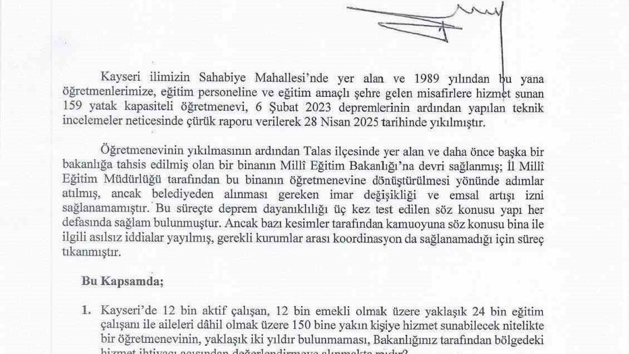 "Kayseri ilimizin Sahabiye Mahallesi’nde yer alan ve 1989 yılından bu yana öğretmenlerimize, eğitim personeline ve eğitim amaçlı şehre gelen misafirlere hizmet sunan 159 yatak kapasiteli öğretmenevi, 6 Şubat 2023 depremlerinin ardından yapılan teknik incelemeler neticesinde çürük raporu verilerek 28 Nisan 2025 tarihinde yıkılmıştır. Öğretmenevinin yıkılmasının ardından Talas ilçesinde yer alan ve daha önce başka bir bakanlığa tahsis edilmiş olan bir binanın Milli Eğitim Bakanlığı’na devri sağlanmış; İl Milli Eğitim Müdürlüğü tarafından bu binanın öğretmenevine dönüştürülmesi yönünde adımlar atılmış, ancak belediyeden alınması gereken imar değişikliği ve emsal artışı izni sağlanamamıştır. Bu süreçte deprem dayanıklılığı üç kez test edilen söz konusu yapı her defasında sağlam bulunmuştur. Ancak bazı kesimler tarafından kamuoyuna söz konusu bina ile ilgili asılsız iddialar yayılmış, gerekli kurumlar arası koordinasyon da sağlanamadığı için süreç tıkanmıştır. Bu kapsamda; Kayseri’de 12 bin aktif çalışan, 12 bin emekli olmak üzere yaklaşık 24 bin eğitim çalışanı ile aileleri dâhil olmak üzere 150 bine yakın kişiye hizmet sunabilecek nitelikte bir öğretmenevinin, yaklaşık iki yıldır bulunmaması, Bakanlığınız tarafından bölgedeki hizmet ihtiyacı açısından değerlendirmeye alınmakta mıdır? Talas ilçesinde tahsis edilen ve üç kez depreme dayanıklı olduğu tespit edilen binanın öğretmenevi olarak kullanılması yönünde Bakanlığınız ne gibi girişimlerde bulunmuştur? Bahse konu binayla ilgili olarak imar artışı talebinin reddedilme gerekçeleri nelerdir? Belediyeler arası mutabakatın sağlanamamasıyla ilgili Bakanlığınız ne gibi adımlar atmıştır ya da atmayı planlamaktadır? Talas’taki mevcut bina dışında, alternatif bir alanda yeni bir öğretmenevi inşa edilmesi konusunda Bakanlığınızın planladığı bir yatırım veya proje mevcut mudur?"