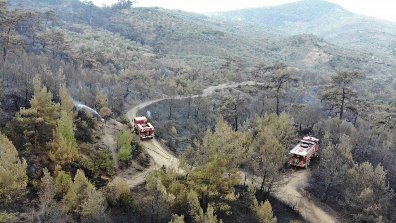 Yangın bölgesindeki son durum dron kamerasıyla havadan görüntülenirken, ekiplerin yangını soğutma çalışmaları aralıksız devam ediyor.