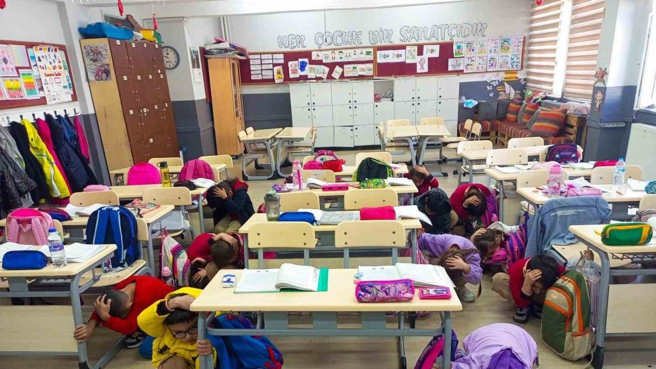 Tatbikat kapsamında öğrenciler, "Çök-Kapan-Tutun" uygulamasıyla bir deprem anında doğru davranış biçimlerini pekiştirirken, öğretmenlerin rehberliğinde güvenli şekilde okul binalarını tahliye etti.