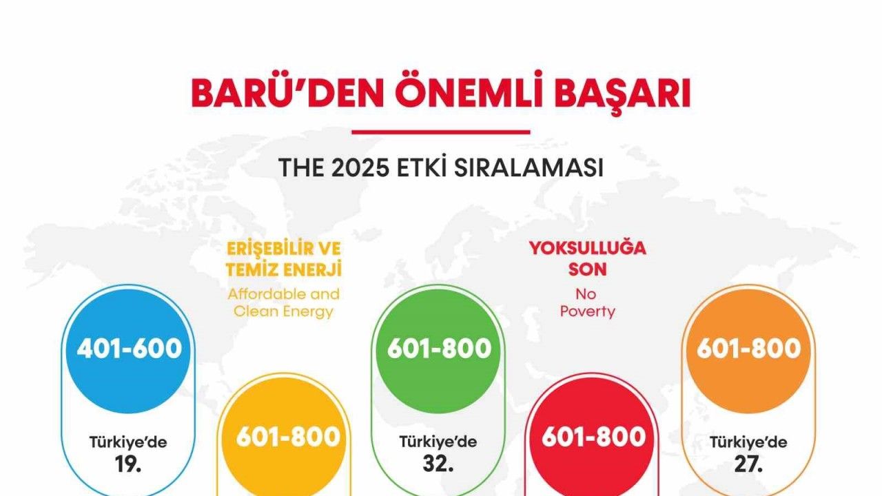 Bu listeye göre 17 alt başlıkta yapılan değerlendirmelerde dünyadaki birçok üniversiteyi geride bırakan BARÜ, sıralamalardaki yerini bu yıl da yükseltti. BARÜ; 2025 Etki Sıralamasında "Sorumlu Üretim ve Tüketim" alanında dünyada 97’nci olarak ilk 100’e girme başarısı gösterdi. "Temiz Su ve Sanitasyon" kategorisinde 101-200; "Açlığa Son", "Eşitsizliklerin Azaltılması", "İklim Eylemi", "Sudaki Yaşam" kategorilerinde ise 401-600 bandında yer almayı başardı.