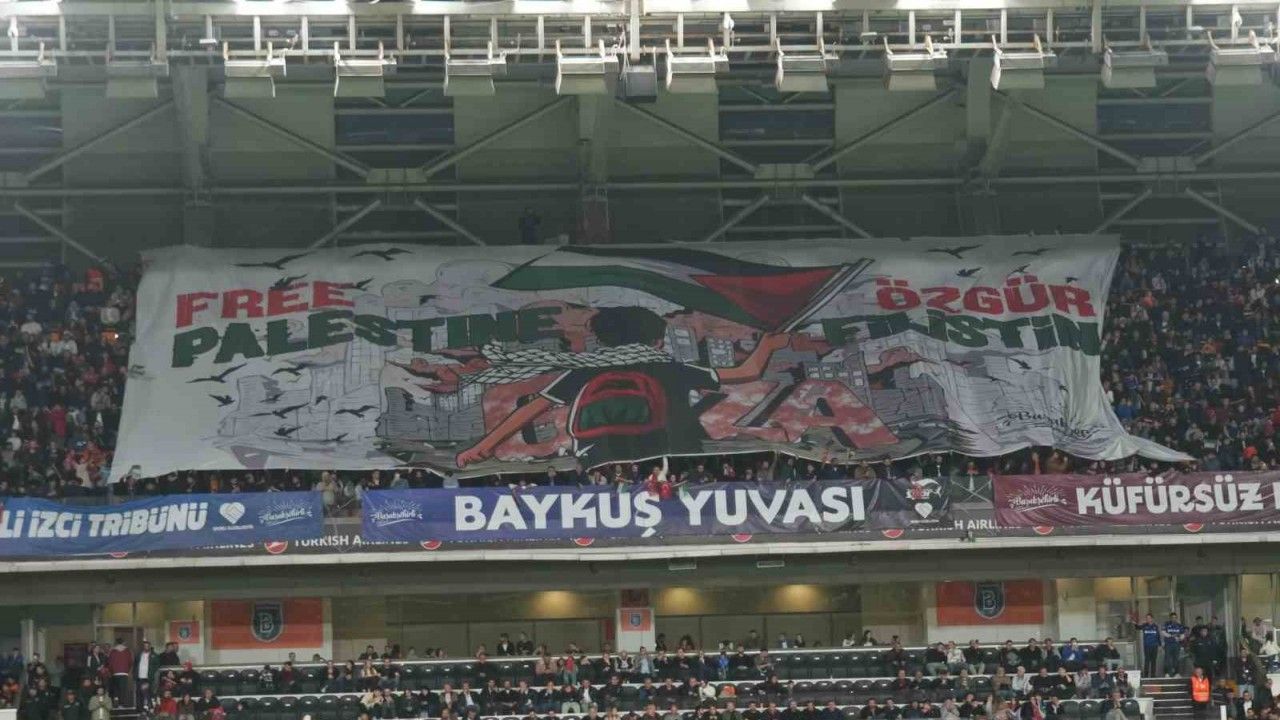 Başakşehir taraftarları, İsrail’in Mescid-i Aksa ve Filistin halkına yönelik saldırılarını protesto etmek amacıyla stadyum tribününde pankart açtı.