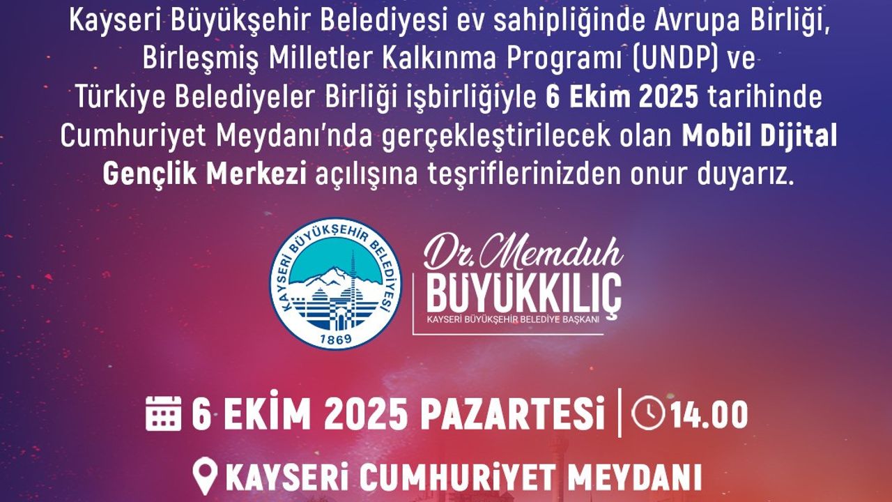 Kayseri Büyükşehir Belediye Başkanı Dr. Memduh Büyükkılıç; "Avrupa Birliği desteğiyle hayata geçirilen ve bilimle teknolojiyi gençlerimizin ayağına götürecek olan Mobil Dijital Gençlik Merkezimizin açılışını, 6 Ekim Pazartesi günü Cumhuriyet Meydanı’nda gerçekleştiriyoruz. Tüm hemşehrilerimizi bu gurur verici güne ortak olmaya davet ediyorum" dedi.