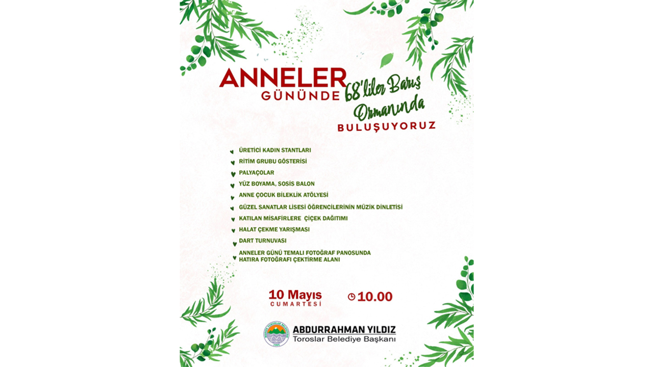 Toroslar Belediye Başkanı Abdurrahman Yıldız, tüm Mersin halkını bu özel etkinliğe davet ederek, "10 Mayıs Cumartesi günü 68'liler Barış Ormanı'nda düzenleyeceğimiz Anneler Günü etkinliğinde; doğanın içinde, neşe dolu bir ortamda bir araya geleceğiz. Arkadaşlarımız, hem yetişkinlerin hem çocukların güzel vakit geçireceği bir program hazırladı. Tüm halkımızı bu anlamlı buluşmaya davet ediyorum" dedi.