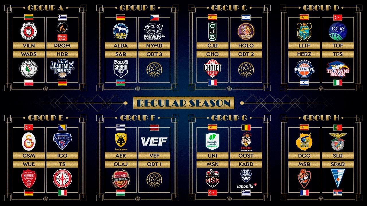 Galatasaray; Igokea m:tel, FIT/One Würzburg Baskets ve Pallacanestro Trieste ile birlikte E Grubu’nda yer aldı. Mersin Spor da G Grubu’nda Unicaja, Filou Oostende ve Karditsa Iaponiki ile eşleşti. Tofaş ise D Grubu’nda La Laguna Tenerife, Bnei Penlink Herzliya ve Trapani Shark ile karşılaşacak.