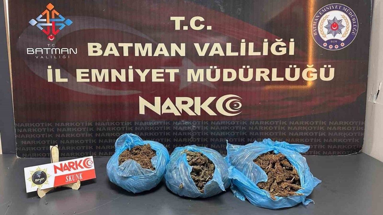 Batman İl Emniyet Müdürlüğü Narkotik Suçlarla Mücadele Şube Müdürlüğü ekipleri tarafından kent girişinde durdurulan bir otomobilde yapılan aramada, 1 kilo 650 gram skunk ele geçirildi. Operasyonda gözaltına alınan 1 şüpheli, işlemlerinin ardından sevk edildiği mahkemece tutuklanarak cezaevine gönderildi.