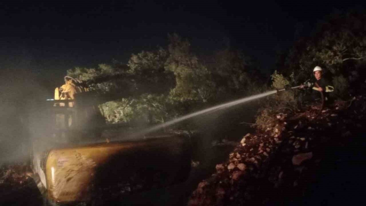 Hatay’da iş makinesinde çıkan yangın, ormanlık alana sıçramadan söndürüldü.
