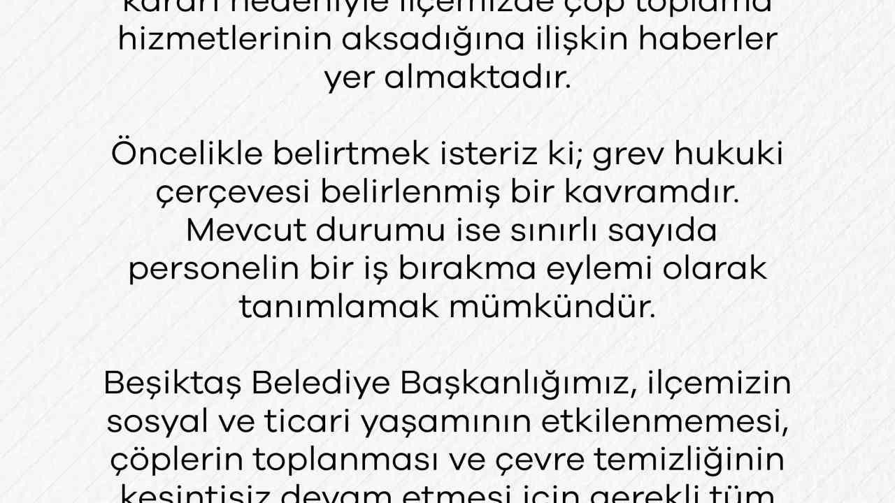 Beşiktaş Belediyesi, çöp toplama ve çevre temizliğine ilişkin çıkan haberlere ilişkin basın açıklaması yaptı. Açıklamada, "Bazı basın ve yayın organlarında, belediyemizde görev yapan işçilerin grev kararı nedeniyle ilçemizde çöp toplama hizmetlerinin aksadığına ilişkin haberler yer almaktadır. Öncelikle belirtmek isteriz ki; grev hukuki çerçevesi belirlenmiş bir kavramdır. Mevcut durumu ise sınırlı sayıda personelin bir iş bırakma eylemi olarak tanımlamak mümkündür. Beşiktaş Belediye Başkanlığımız, ilçemizin sosyal ve ticari yaşamının etkilenmemesi, çöplerin toplanması ve çevre temizliğinin kesintisiz devam etmesi için gerekli tüm tedbirleri almaya kararlıdır" ifadelerine yer verildi.