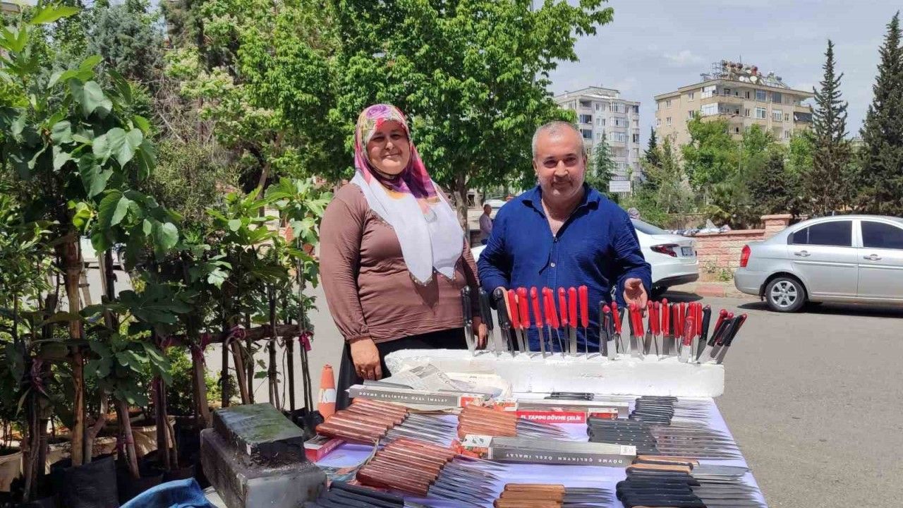 Kardeşleriyle bıçakçılık yapan 50 yaşındaki Müslim Okutucu’ya, 4 çocuk annesi eşi Fatma Okutucu’da (44) yardım ediyor. Çift, bayrama sayılı günler kala Merkez Onikişubat İlçesi Necip Fazıl Kültür Merkezi arkasında bıçak satıp bileme yapıyor.