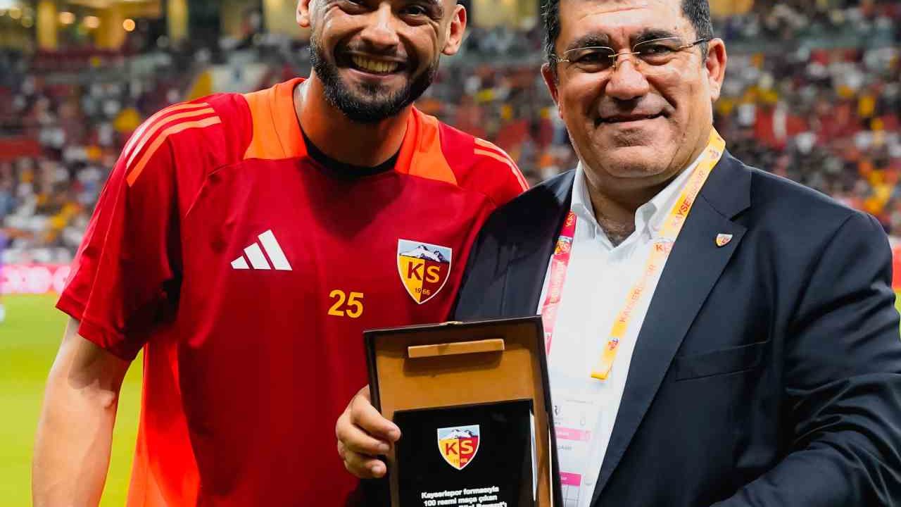 Galatasaray maçı öncesi Kayserispor Başkanı Nurettin Açıkalın; sarı kırmızılı takımda 100. maçına çıkan oyuncusu Bilal Bayazıt’a üzerinde ismi yazılı 100 numaralı forma ile plaket hediye takdim etti.