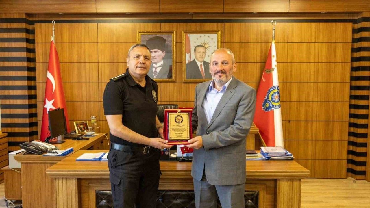Bilecik İl Emniyet Müdürü Hakan Yılmaz, emekliye ayrılan polis memuru Alişan Aksoy’a plaket takdim etti.
