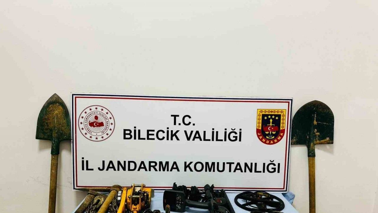 Bilecik’in Osmaneli ilçesi Belenalan köyü sınırları içerisinde bulunan ormanlık alanda kaçak kazı yapıldığı ihbarı üzerine jandarma ekipleri harekete geçti. Bölgeye intikal eden ekipler, Kom Şube Müdürlüğü ekipleriyle birlikte gerçekleştirdikleri ortak operasyonla 5 kişiyi suçüstü yakaladı. Operasyonda A.Y., E.İ., M.Ç., H.M. ve B.F. isimli şüpheliler zor kullanılmadan gözaltına alındı. Olay yerinde yapılan aramada 2 kürek, 1 kazma, 2 balta, 1 calaskal, 3 parça halinde toplam 5 metre uzunluğunda zincir çeki halatı, 1 el dedektörü, 2 dedektör ucu, 1 dedektör kulaklığı, 1 batarya, 1 maket bıçağı, 1 bilgisayar bağlantı kablosu, 1 el küreği, 1 testereli bıçak, 1 kamp baltası ve 1 çakmaklık şarj aleti ele geçirildi.