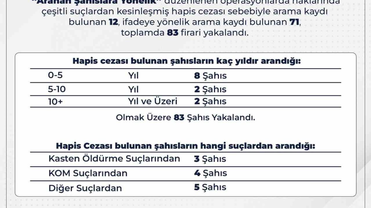 Bingöl’de düzenlenen uygulamalarda haklarında kesinleşmiş hapis cezası ile araması bulunan 83 şahıs yakalandı.