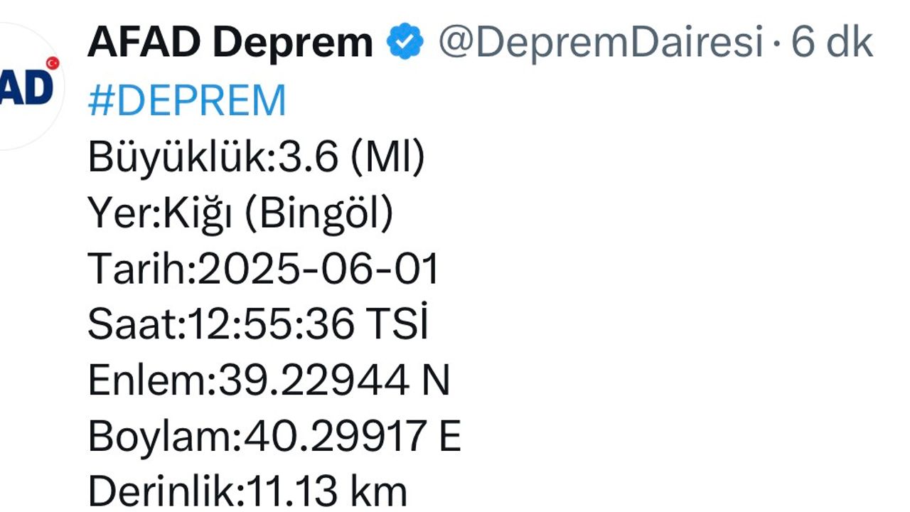 AFAD’dan yapılan açıklamaya göre, saat 12.26’da merkez üssü Bingöl’ün Kiğı ilçesi olan 4,4 büyüklüğünde deprem meydana gelmişti. Yarım saat sonra merkez üssü yine Kiğı olan 3,6 büyüklüğünde bir deprem daha meydana geldi. Yaklaşık 11 kilometre derinlikte meydana gelen depremde ilgili herhangi bir olumsuzluğun yaşanmadığı bildirildi. Peş peşe meydana gelen depremler ilçe halkını korkuttu.