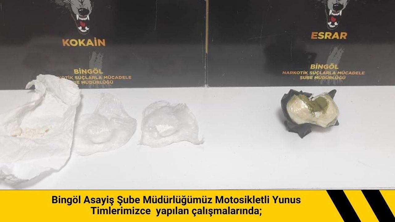Bingöl Emniyet Müdürlüğü Asayiş Şube Müdürlüğü motosikletli yunus timlerince yapılan çalışmalar neticesinde 20 gram toz esrar ile 5 gram kokain ele geçirildi. 2 şüpheli hakkında adli işlem başlatıldı.