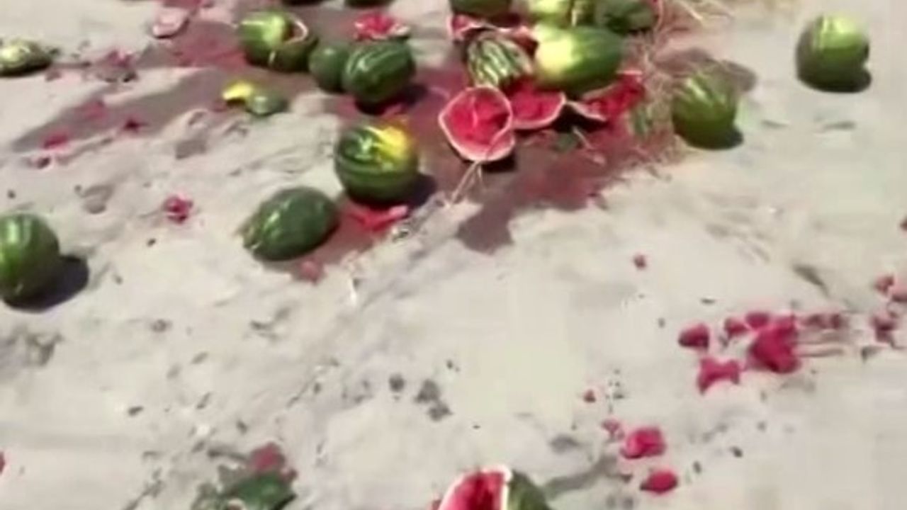 Sakarya’nın Geyve ilçesinde bir çiftçi, mahsulünün para etmemesine tepki göstererek, bir römork dolusu karpuzu yere fırlattı. O anlar cep telefonu kamerası ile saniye saniye kaydedildi.