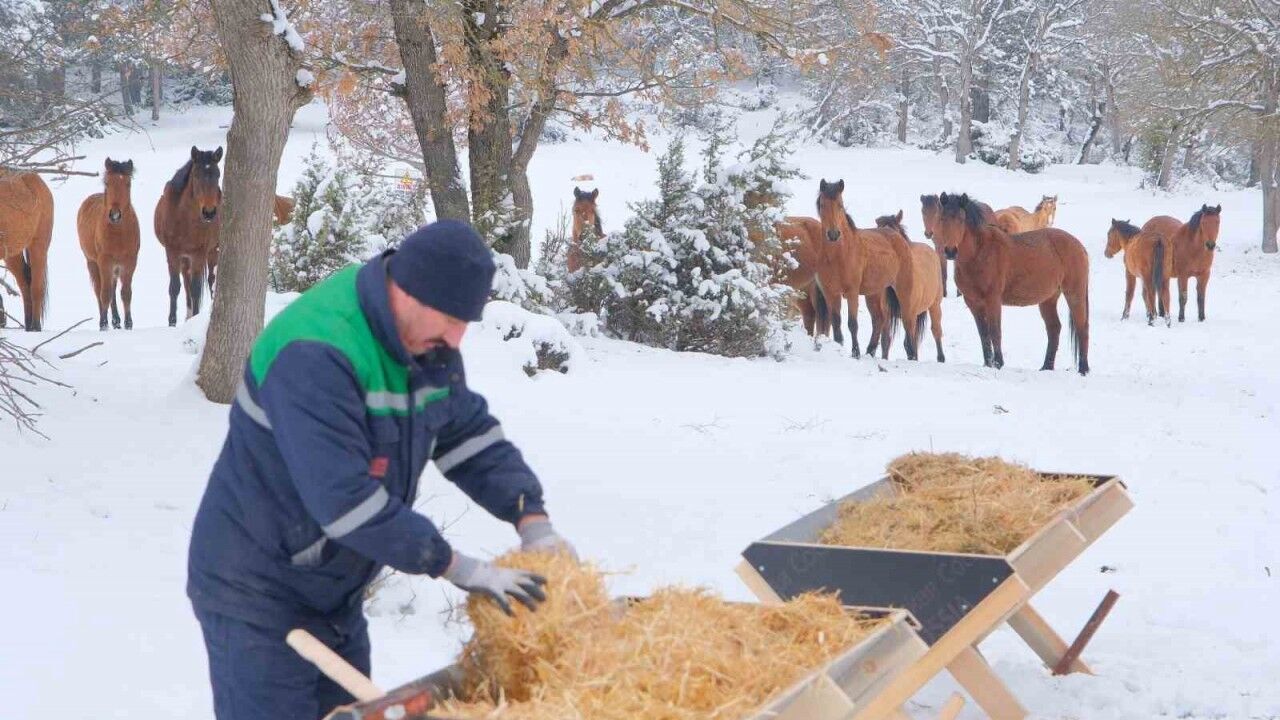 Bolu’nun At Yaylası’nda etkili olan yoğun kar yağışı ve soğuk hava nedeniyle yiyecek bulmakta zorlanan yılkı atları için Bolu Belediyesi ekipleri yemleme çalışması yaptı.
